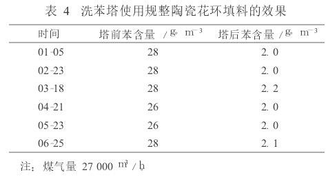 山西古縣晉豫焦化廠 3 400mm× 3 000mm洗苯塔使用的是規(guī)整陶瓷花環(huán)填料,裝填填料145m 3,配套600kt/a焦化項(xiàng)目,填料總造價(jià)19.58萬元。自2005年12月投產(chǎn)至今,使用效果良好。 2009年洗苯塔前、后苯含量如表4。
