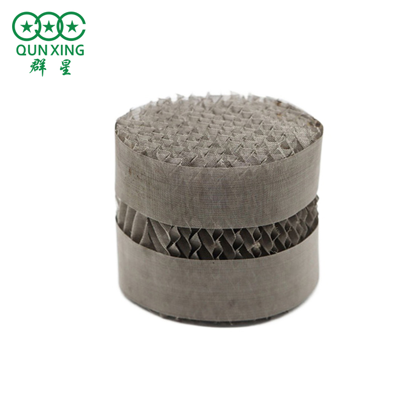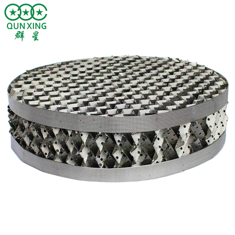 孔板波紋填料是規(guī)整填料的一種。它是由若干彼此平行,垂直排列表面有溝紋的孔板片組成,波紋與塔軸方向成一定夾角,相鄰板片波紋方向相反,使板片間形成交叉三角形通道,因此具有以下特點: