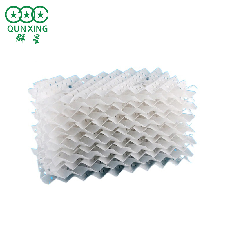 (1)幾何特性 塑料板波紋填料與金屬板波紋填料結(jié)構(gòu)相似,是由彼此平行、交 叉后垂直排列的波紋板片組成盤型的規(guī)整填料。填料板片上可開有小孔以提高分離能力。組成盤狀的填料在塔中上、下相鄰的兩盤應(yīng)交錯90°。未經(jīng)處理的塑料一般有憎水性能,必要時可通過物理、化學等方法來改善塑料的潤濕性能。塑料板波紋填料的基本特性參數(shù)主要取決于填料板片的波紋峰高,而決定波紋形狀的主要參數(shù)尚有傾角、波距、板厚等因素,其原理與金屬板波紋填料相似。